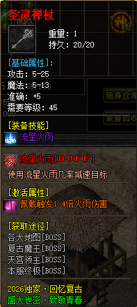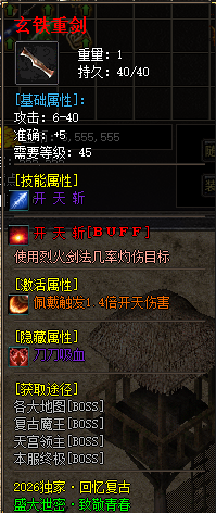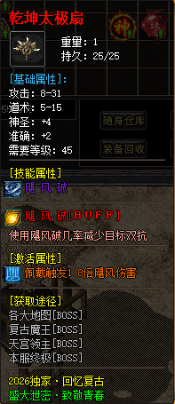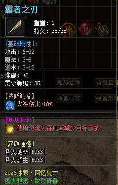 【装备介绍】 商店货→沃玛→祖玛→赤月套→复古战狂→所有装备暴率都很低,绝不会烂安全区的存在长期养老!